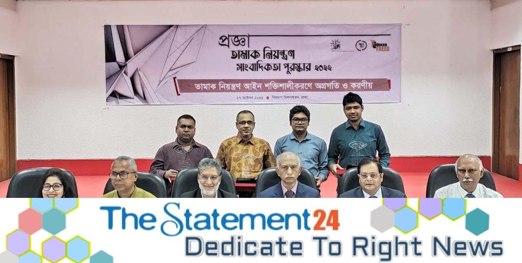 The Ministry of Health and Family Welfare’s (MoHFW)’s initiative to strengthen the tobacco control law is a timely one. To reduce the deaths and losses incurred by tobacco, the draft amendment must be finalized and passed at the earliest. Speakers said this today (27 October 2022, Thursday) during the PROGGA Tobacco Control Journalism Award held at the CIRDAP Auditorium of the Capital. Journalists who won the awards received BDT 50,000, a certificate and a crest. The winners of the accolade include Shamimul Haque, Joint Editor, the Daily Manabjamin and Mohammad Al Amin, Senior Staff Correspondent, the Daily Sun (under the Print Media category); Mosabber Hossain, Senior Reporter, the Daily Prothom Alo (under Online Media category); and Anowar Hossain, Staff Reporter, Desh Television (under TV Media category). The event was jointly organized by PROGGA (Knowledge for Progress) and Anti-Tobacco Media Alliance (ATMA), with support from Campaign for Tobacco-free Kids (CTFK).