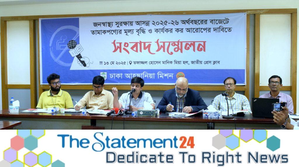 They made this appeal during a press conference titled “Demand for Price Increase and Effective Taxation on Tobacco Products in the Upcoming 2025–26 Budget for the Protection of Public Health,” organized by Dhaka Ahsania Mission at the National Press Club on May 13, 2025.