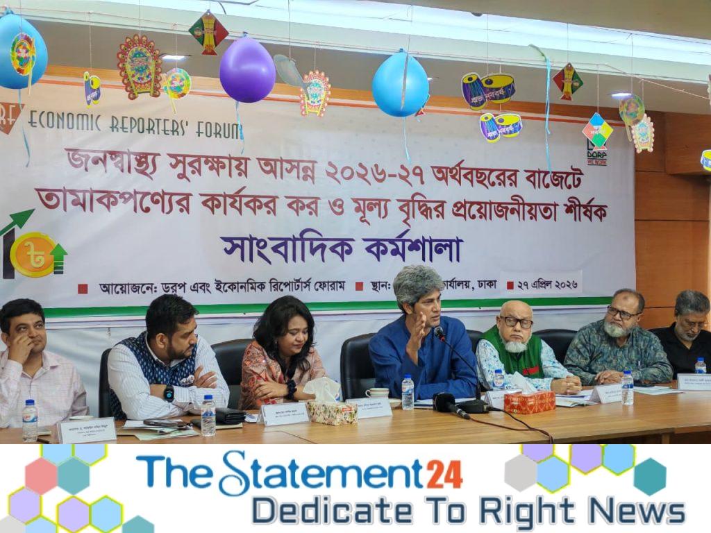 The Economic Reporters’ Forum has called for effective taxation and price increases on Tobacco products in the upcoming national budget for fiscal year 2026–27 to protect public health. The demand was made at a journalists’ workshop titled “The Need for Effective Tax and Price Increase on Tobacco Products in the Upcoming FY2026–27 Budget for Protecting Public Health,” jointly organised by Development Organisation of the Rural Poor-DORP and the Economic Reporters’ Forum at the ERF office on Monday, 27 April 2026.