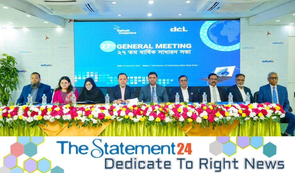 The 27th Annual General Meeting of country’s leading IT company Daffodil Computers Ltd., was held today on 29th December, 2024 at Hybrid Platform. Ms. Shahana Khan, Chairperson of Daffodil Computers Ltd. presided over the Annual General Meeting and the Managing Director presented the Annual Report for the year 2023-2024. A significant number of shareholders including directors, independent directors and company secretary of Daffodil Computers Ltd participated directly and online in the meeting. In the meeting, the shareholders approved the financial year 2023-2024 accounts with 5% cash dividend and proposed to apply to the Securities and Exchange Commission for issue of shares in lieu of debt at an average rate or a minimum of Tk 40.and allowed conversion of Daffodil Computers Ltd. into Daffodil Computers PLC. The AGM was concluded by expressing hope for doing better business in the coming financial year.