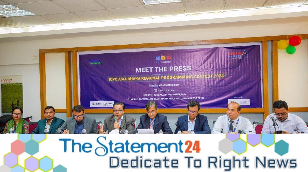 Daffodil International University is hosting ICPC-2024 (International Collegiate Programming Contest-2024) Asia Regional Dhaka Site on December 07, 2024 at Shadhinota Sommelon Kendra of the university at Daffodil Smart City at Birulia, Savar Dhaka. This was announced in a ” Meet the Press Program held today on November 24, 2024 at National Press Club in the capital. Professor Dr. Syed Akhter Hossain, Regional Contest Director and Dean, Faculty of Science and Information Technology (FSIT) of Daffodil International University uphold the details and special features of the event at the “Meet the Press Program. Dr. Nadir Bin Ali, Registrar, Daffodil International University presided over the “Meet the Press”. The `Meet the Press’ was also addressed by Mr. Saiful Islam, Deputy Regional Contest Director, Mr. Md. Shah Alam Patwary, Deputy Managing Director, Dutch Bangla Bank Ltd. Mr. Md. Golam Rabbani, Manager, ( Systems), Bangladesh Computer Council, Mr. Mr. Md. Jahangir Alam, Assistant Professor, Mr.Md. Ferdous Ahmed Faisal, Lecturer, Ms. Tanjima Afroz Rimi, Lecturer of CSE Department and Md. Anowar Habib Kazal, Senior Assistant Director (Public Relations) of Daffodil International University
