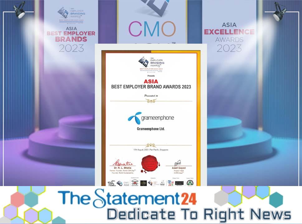 Grameenphone has won the prestigious ‘Asia’s Best Employer Brands 2023’ award at the 18th Employer Branding Awards event, held recently at the Pan Pacific Singapore. Hosted by the Employer Branding Institute, the award aimed at recognizing the outstanding contributions by organizations with regards to talent management, talent development and talent innovation.