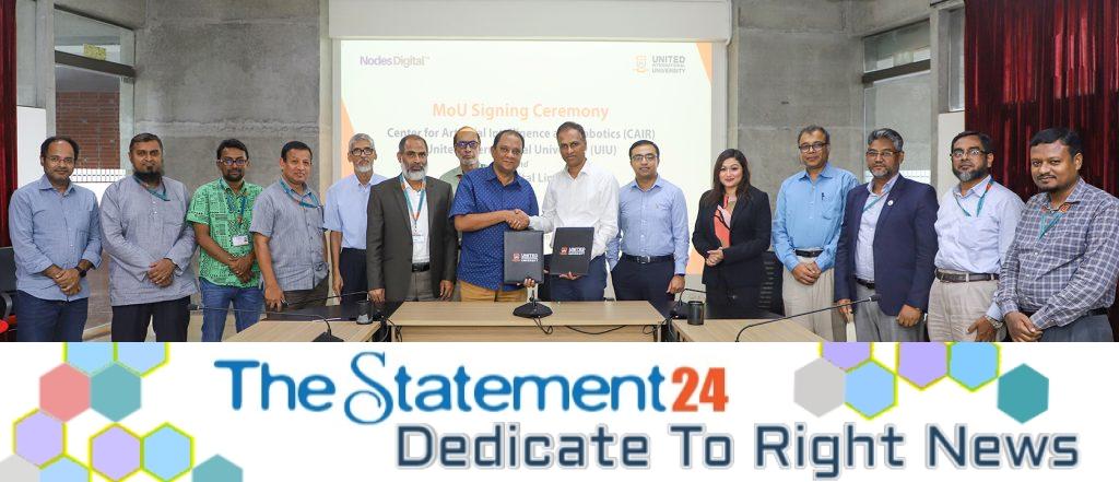 A Memorandum of Understanding (MoU) was signed between the Centre for Artificial Intelligence and Robotics (CAIR) of United International University (UIU) and Nodes Digital Ltd. for research collaboration yesterday at UIU Campus, United City, Madani Avenue, Dhaka- 1212.