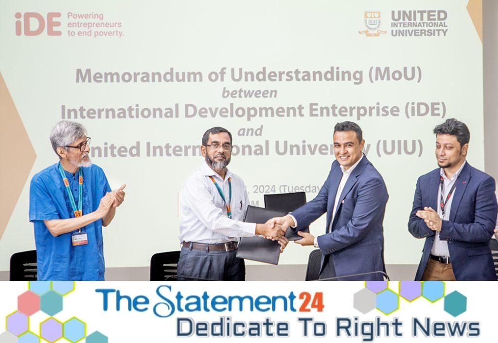 A Memorandum of Understanding (MoU) was signed between United International University (UIU) and International Development Enterprise (iDE) for research collaboration on 28 May 2024 (Tuesday) at UIU Campus, United City, Madani Avenue, Dhaka- 1212.