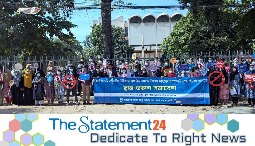 This demand was raised during a youth gathering titled “Demand for Banning E-Cigarettes and Vaping and Immediate Passage of Proposed Tobacco Control Law Amendments”, held in front of the National Museum at Shahbagh, Dhaka, on Thursday morning. Over a hundred students from various universities, including Dhaka University and Jahangirnagar University, participated in the event.