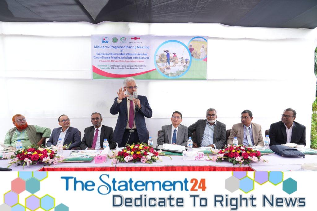 `Farmers are the key actor of Bangladesh. Along with the government, farmers, teachers, researchers, journalists and non-governmental development organizations should work together on the agricultural system and Haor rice. No one can do anything alone.’ Mohammad Abdur Rouf, Managing Director of Dhaka Mass Transit Company Limited (Metrorail) said these as the chief guest at a meeting organized at the regional office of Bangladesh Rice Research Institute in Habiganj recently. A mid-term progress sharing meeting was held for Practice and Dissemination of Disaster Resistant Climate Change Adaptable Crop Cultivation Expansion Project in the Haor area implemented by ASED Habiganj and Share the Planet Association Japan. This project is funded by JICA amd technical support by Bangladesh Rice Research Institute. Tetsuo Tsutsui, Chairperson of Share the Planet Association of Japan, Nurul Islam, Chief Executive Officer of Habiganj Zilla Parishad, Dr. Hirendra Nath Barman, PSO and head, Bangladesh Rice Research Institute, Regional office of Habiganj, Md. Ishaque Faruquee, feature editor of Daily Rupali Bangladesh attended the event as special guests. The meeting was presided over by Md. Dabirul Islam, former additional secretary of the People’s Republic of Bangladesh.. Apart from this, officers from all departments of district and upazila level government administrators of Habiganj, teachers and students of various universities, colleges and schools, representatives of several non-governmental organizations, chairman of Union Parishad and farmers related to local level projects and officers at all levels of ASED Habiganj were present as guests in the meeting.