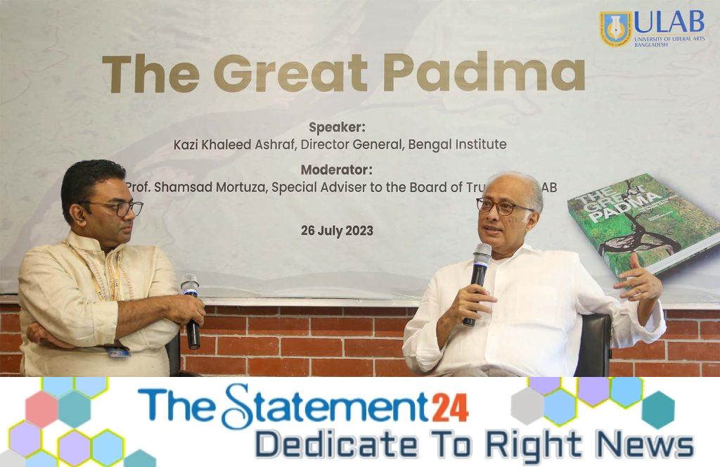 The University of Liberal Arts Bangladesh (ULAB) recently organized a book talk on the publication, “The Great Padma.” Authored by the Architect Kazi Khaleed Ashraf, the event took place on Wednesday, July 26, 2023, at the ULAB campus. The engaging discussion featured the editor and author, Kazi Khaleed Ashraf, in conversation with Prof. Shamsad Mortuza, Special Adviser to the ULAB Board of Trustees. The event commenced with the opening remarks by ULAB Vice Chancellor, Prof. Imran Rahman.