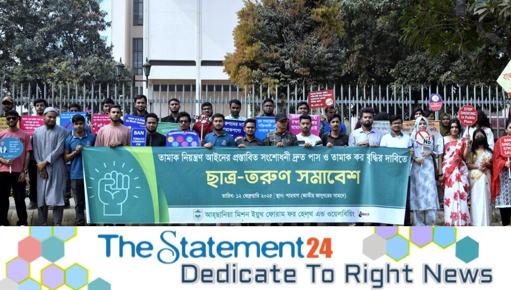 On Wednesday, February 12, 2025, students from Dhaka University, Jahangirnagar University, Bangladesh University, UITS, International University of Scholars, Dhaka International University, and others gathered in front of the National Museum at Shahbagh, Dhaka, organized by the Ahsania Mission Youth Forum for Health and Well-being. They participated in a student-youth rally titled “Demand for Immediate Passage of Proposed Amendment to the Tobacco Control Law and Increase in Tobacco Tax.”